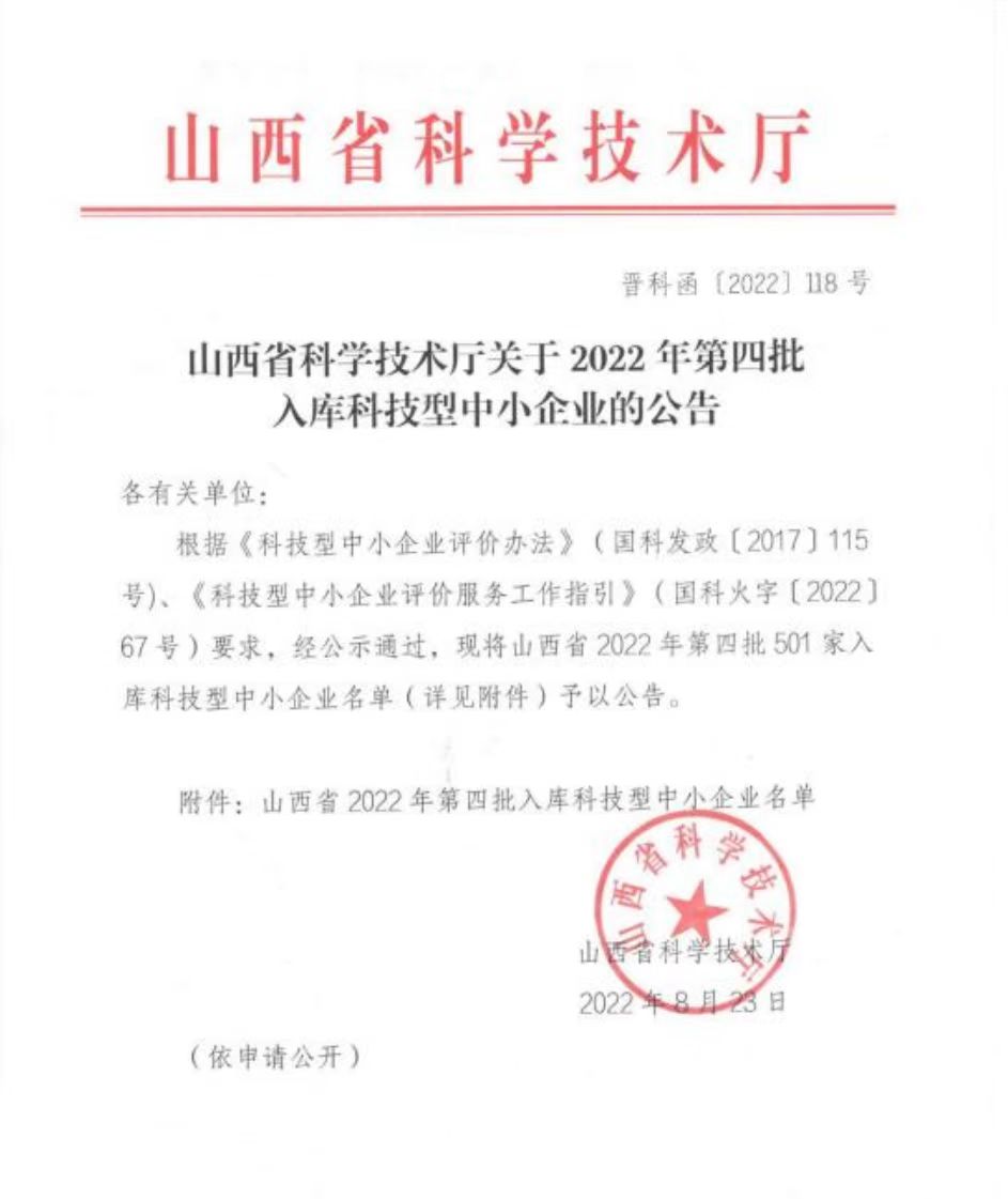 根據《科技型中小企業評價辦法》(國科發政[2017]115號)、《科技型中小企業評價服務工作指引》(國科火字[2022]67號)要求,經公示通過,我公司入庫2022年第四批科技型中小企業。